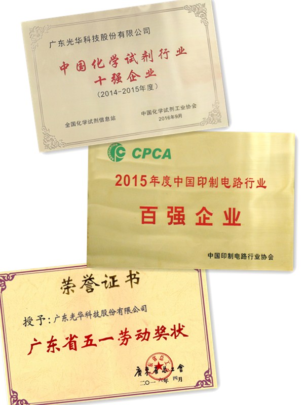30多年來,光華科技一直專注于“高性能電子化學(xué)品”和“高質(zhì)量化學(xué)試劑”為主導(dǎo)的專用化學(xué)品產(chǎn)業(yè)領(lǐng)域,在PCB行業(yè)及化學(xué)試劑行業(yè)獲得了社會的普遍認(rèn)可: ● 再次榮獲“中國PCB專用化學(xué)品第1名” ● 再次榮獲“化學(xué)試劑行業(yè)十強(qiáng)企業(yè)” ● 氧化銅、硫酸鎳產(chǎn)品被評為“廣東省名牌產(chǎn)品” ● 被評為“廣東省創(chuàng)新型企業(yè)” ● 被評為“國家知識產(chǎn)權(quán)優(yōu)勢企業(yè)” ● 獲頒“廣東省五一勞動獎狀” |