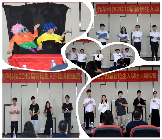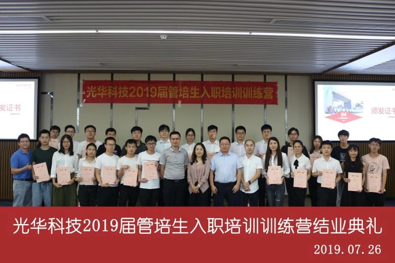 7月初,光華科技迎來了一批新生力量——2019屆管培生,為了幫助大家完成從在校生到職場人的華麗轉(zhuǎn)身,公司精心打造了管培生入職培訓訓練營,隨著軍訓鍛煉、文化融入、理論授課和上崗實操等一系列干貨滿滿的培訓安排后,光華科技2019屆管培生入職培訓訓練營慢慢落下帷幕。7月末,在公司領導的指導下,經(jīng)過人資部門的精心策劃,全體管培生們積極參與和排練,給大家呈現(xiàn)了一臺精彩的結業(yè)典禮。