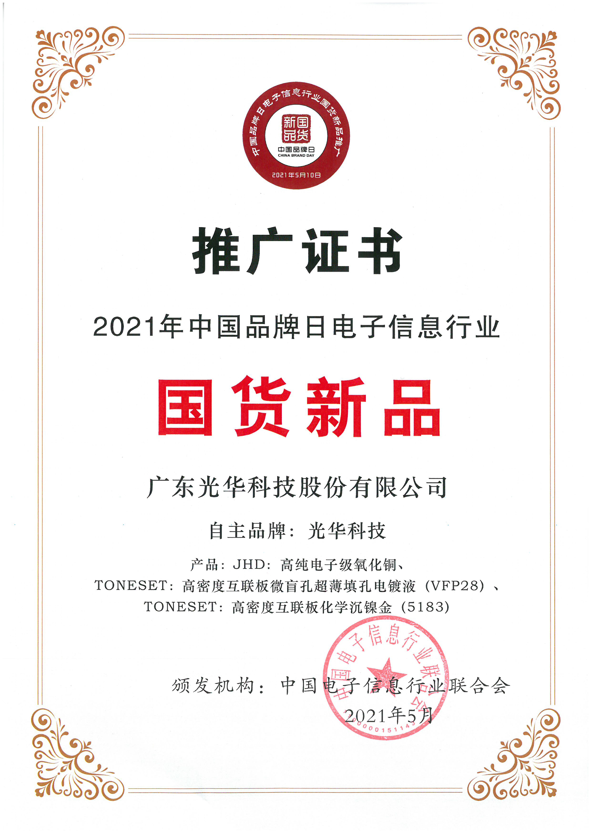 2021年是“十四五規(guī)劃”的開局之年,也是中國品牌建設(shè)的關(guān)鍵之年,中國越來越多品牌已成為國家名片。在今年中國品牌日活動(dòng)中,光華科技旗下產(chǎn)品品牌JHD的高純電子級(jí)氧化銅,憑借廣泛應(yīng)用于集成電路領(lǐng)域、質(zhì)量達(dá)到國際領(lǐng)先水平、與全球知名標(biāo)桿客戶長期戰(zhàn)略合作等優(yōu)勢(shì)脫穎而出,入選由中國電子信息行業(yè)聯(lián)合會(huì)頒發(fā)的“2021年中國品牌日電子信息行業(yè)國貨新品”目錄。“國貨”光華科技高純電子級(jí)氧化銅為何做到行業(yè)持續(xù)領(lǐng)先?下面為您一一揭秘!
