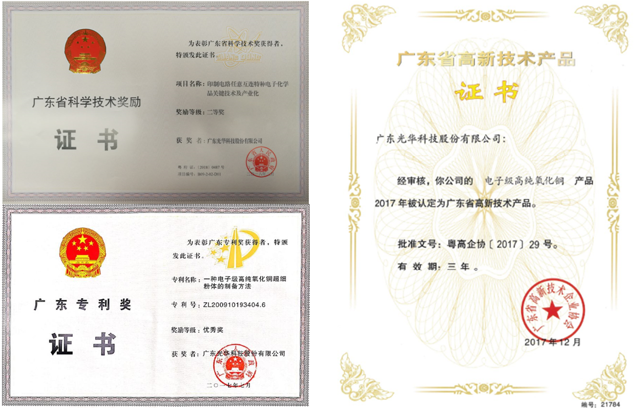 憑借雄厚的研發(fā)實(shí)力、先進(jìn)的生產(chǎn)技術(shù)、獨(dú)特的制備方法和優(yōu)異的性能指標(biāo),光華科技高純電子級(jí)氧化銅曾獲得美國授權(quán)專利證書,并獲得由政府單位評(píng)定的榮譽(yù)資質(zhì)——由廣東省知識(shí)產(chǎn)權(quán)局頒發(fā)的“廣東省專利銀獎(jiǎng)”、由廣東省人民政府頒發(fā)的“廣東省科學(xué)技術(shù)二等獎(jiǎng)”、由科學(xué)技術(shù)部頒發(fā)的“國家重點(diǎn)新產(chǎn)品”等多項(xiàng)獎(jiǎng)勵(lì)與稱號(hào)。今年中國品牌日,光華科技高純電子級(jí)氧化銅又再次獲得美譽(yù),成功入選“國貨新品”目錄。這是對(duì)光華科技電子級(jí)氧化銅一個(gè)有分量的肯定,也充分體現(xiàn)了光華科技不斷滿足客戶需求和市場(chǎng)發(fā)展,對(duì)產(chǎn)品技術(shù)迭代升級(jí)與創(chuàng)新的不懈追求。